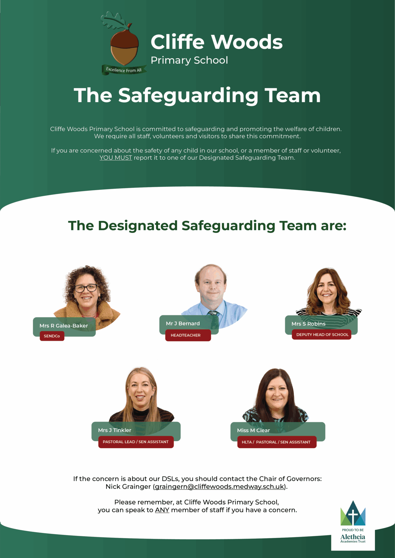 The Designated Safeguarding Lead is Mrs Galea-Baker (SENDCo), The Deputy Safeguarding Leads are Mrs Connolly (Head of School) Mrs Robins (Deputy Head of School), Jayne Tinkler (Pastoral Lead/SEN Team) and Mel Clear (Pastoral Assistant/SEN Team). The Child Protection and Safeguarding Policy is available on the policies page.